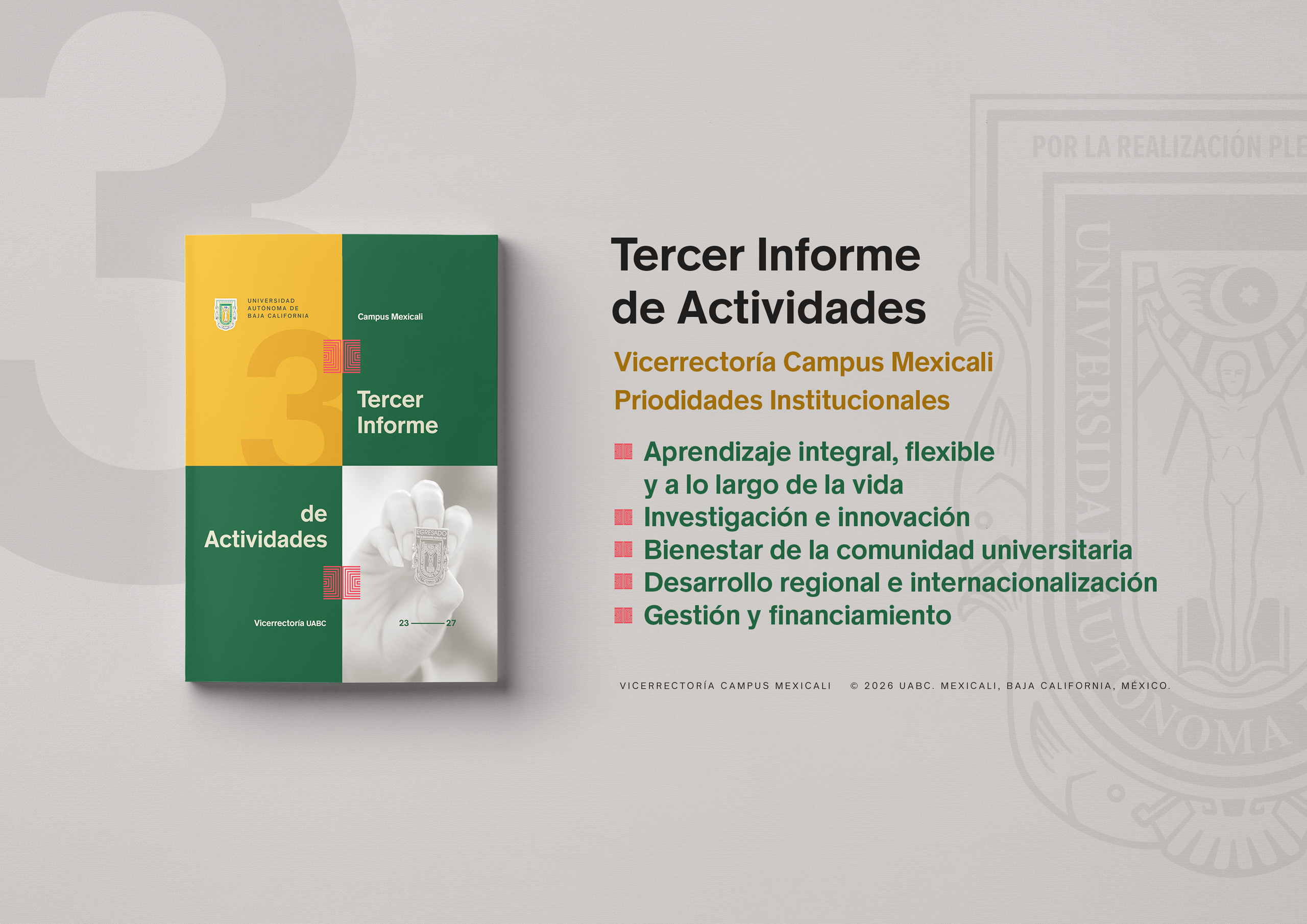En cumplimiento del Reglamento de Planeación de la UABC, presento el Tercer Informe de Actividades 2025 del campus Mexicali, en el marco del Programa de Desarrollo de la Vicerrectoría (2023-2027), alineado con el Plan de Desarrollo Institucional.